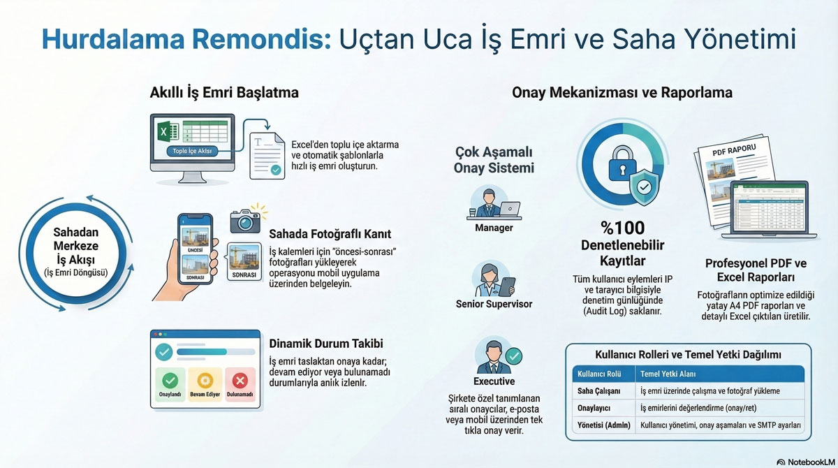 Platform ayrıca çoklu şirket desteği, gelişmiş Excel entegrasyonu ve otomatik PDF raporlama gibi güçlü özellikler sunuyor. Tüm onay süreçleri ve işlem geçmişi sistemde kayıt altına alınarak hem raporlama hem de denetim süreçlerinde kullanılabiliyor. Mobil uyumlu yapısı sayesinde saha ekipleri işlemlerini doğrudan sahadan gerçekleştirebilirken, yöneticiler de operasyonların ilerleyişini anlık olarak takip edebiliyor.